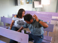 He is taking on more responsibility for facilitating the Monday night DVD teaching for pastors. This picture shows him praying for Abigail, translator for our 2006 healing seminar.
